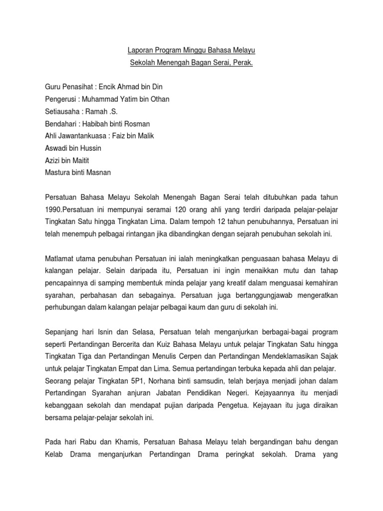 Saya sebagai seorang pelajar sekolah menengah membaca contoh laporan ini saya berasa amat kagum dengan hasil yang dibuat oleh cikgu. Laporan tersebut berfungsi sebagai bentuk tanggung jawab sekaligus bukti bahwa seseorang sudah mengikuti. Program Bulan Bahasa dan Sastera Program koakademik bahasa Melayu peringkat negeri bahas ala parlimen- pesta pantun forum remaja pidato deklamasi puisi- shahiba bicara berirama syarahan Program Cakna Bahasa Diadakan semasa perhimpunan pagi.